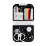 Kit de costura prático e leve para levar em viagem. Composto por 3 alfinetes, 3 agulhas, 1 pinça, 1 tesoura, 1 enfia linha, 1 alfinete, 2 botões, 2 colchetes e 6 rolos de linhas de várias cores. Fornecido em estojo. 70 x 21 x 65 mm