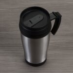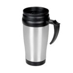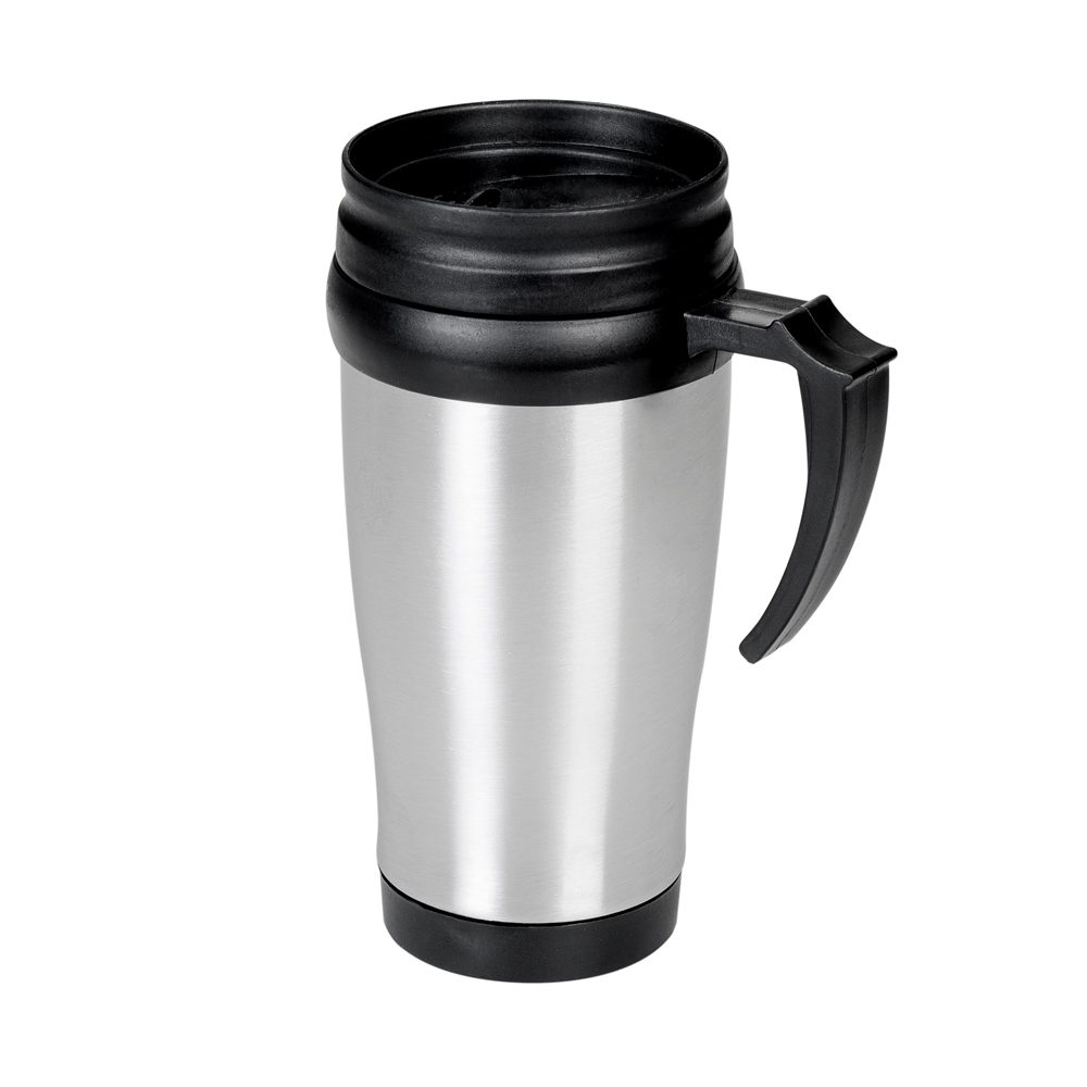 Caneca de inox com detalhes plásticos, capacidade de 400ml. Tampa com vedação e bocal com trava de segurança.