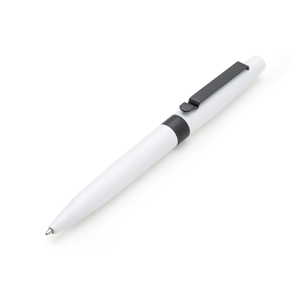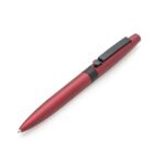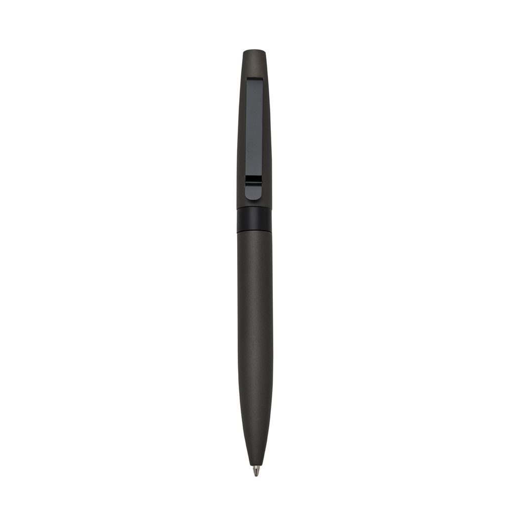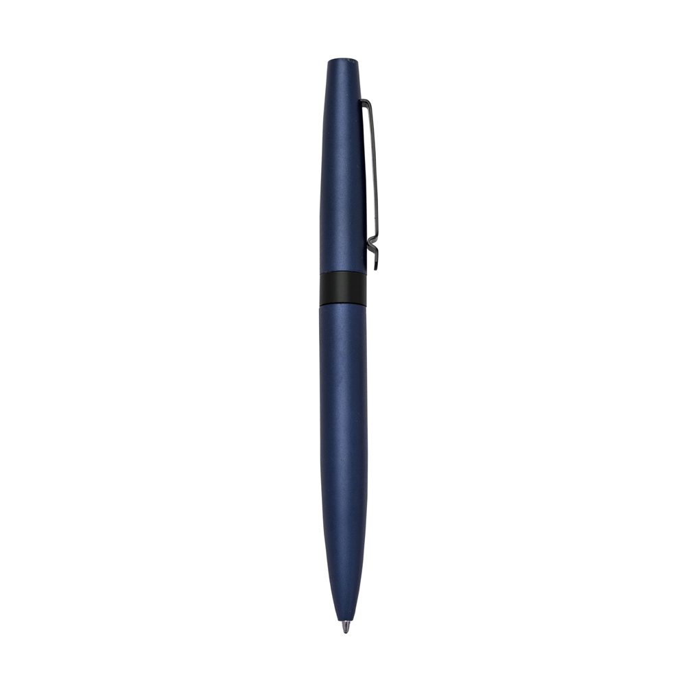 Caneta metálica com detalhes em preto, acionamento por rotação e carga esferográfica azul. OBS.: PEDIDO APENAS MÚLTIPLO DE 50 PEÇAS!