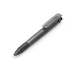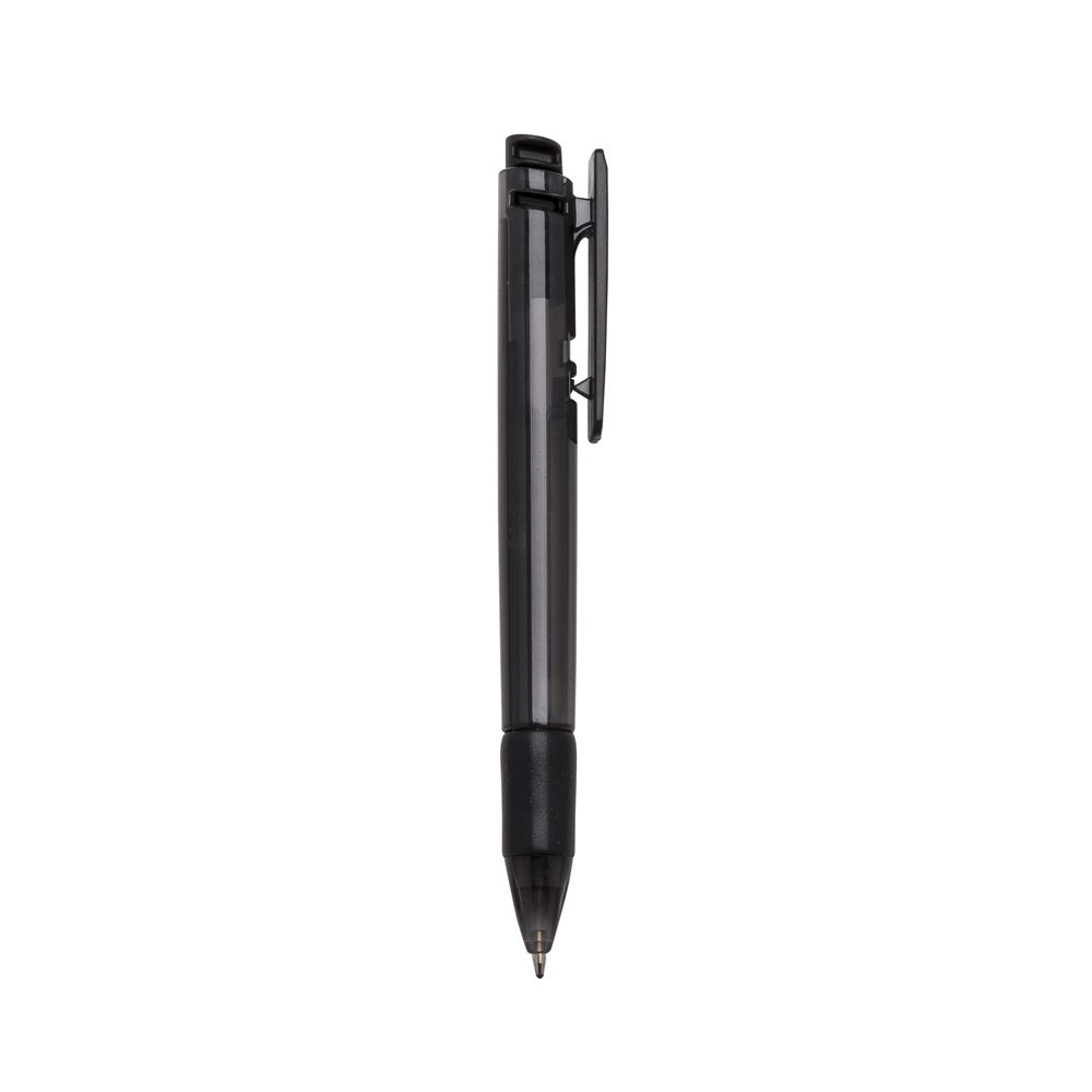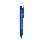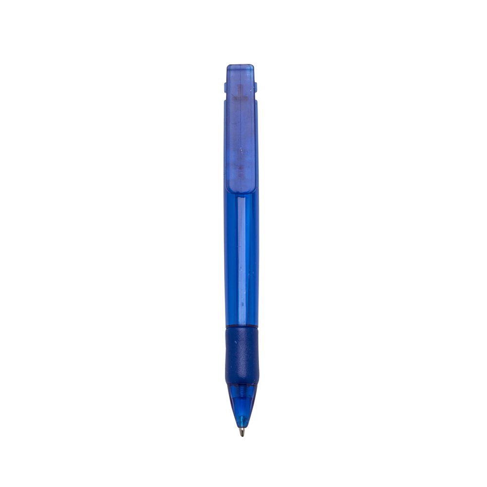 Caneta plástica inteira colorida com detalhe emborrachado. Possui dois traços vazados na parte superior e acionador com detalhes em relevo. Aciona por clique, para destravar bastar pressionar o clip.