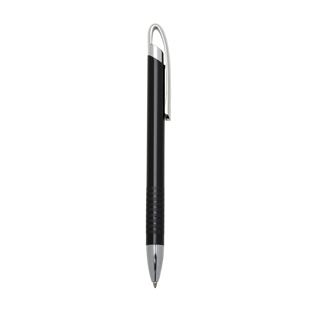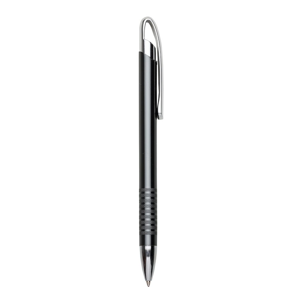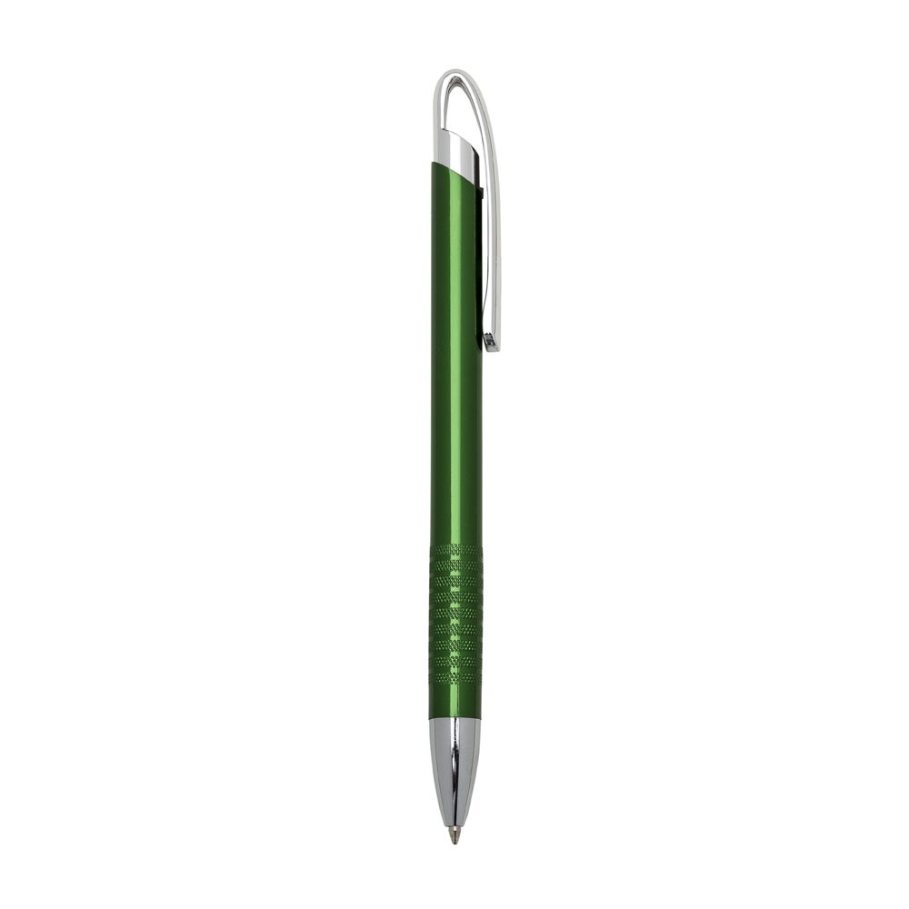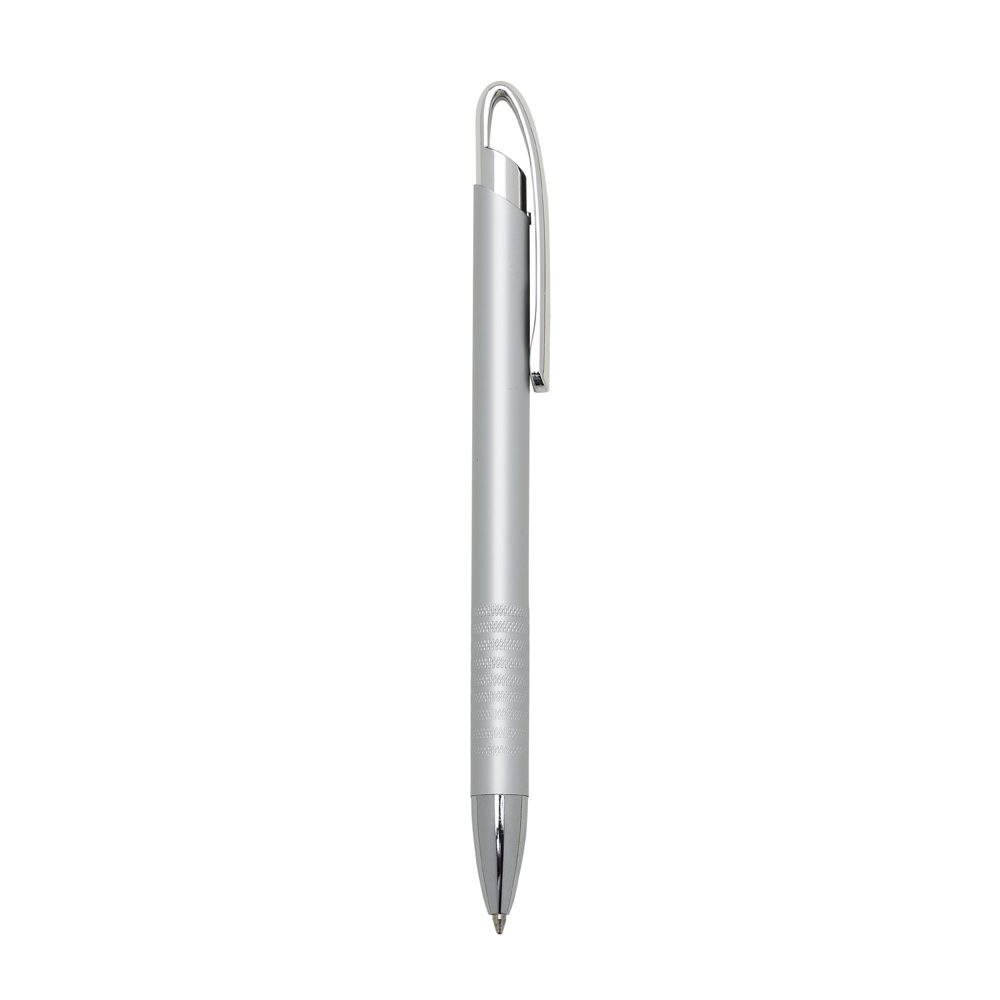 Caneta semimetal inteira colorida com detalhes prata. Clip metal prata e nove anéis inferiores em relevo colorido. Aciona por clique.