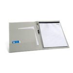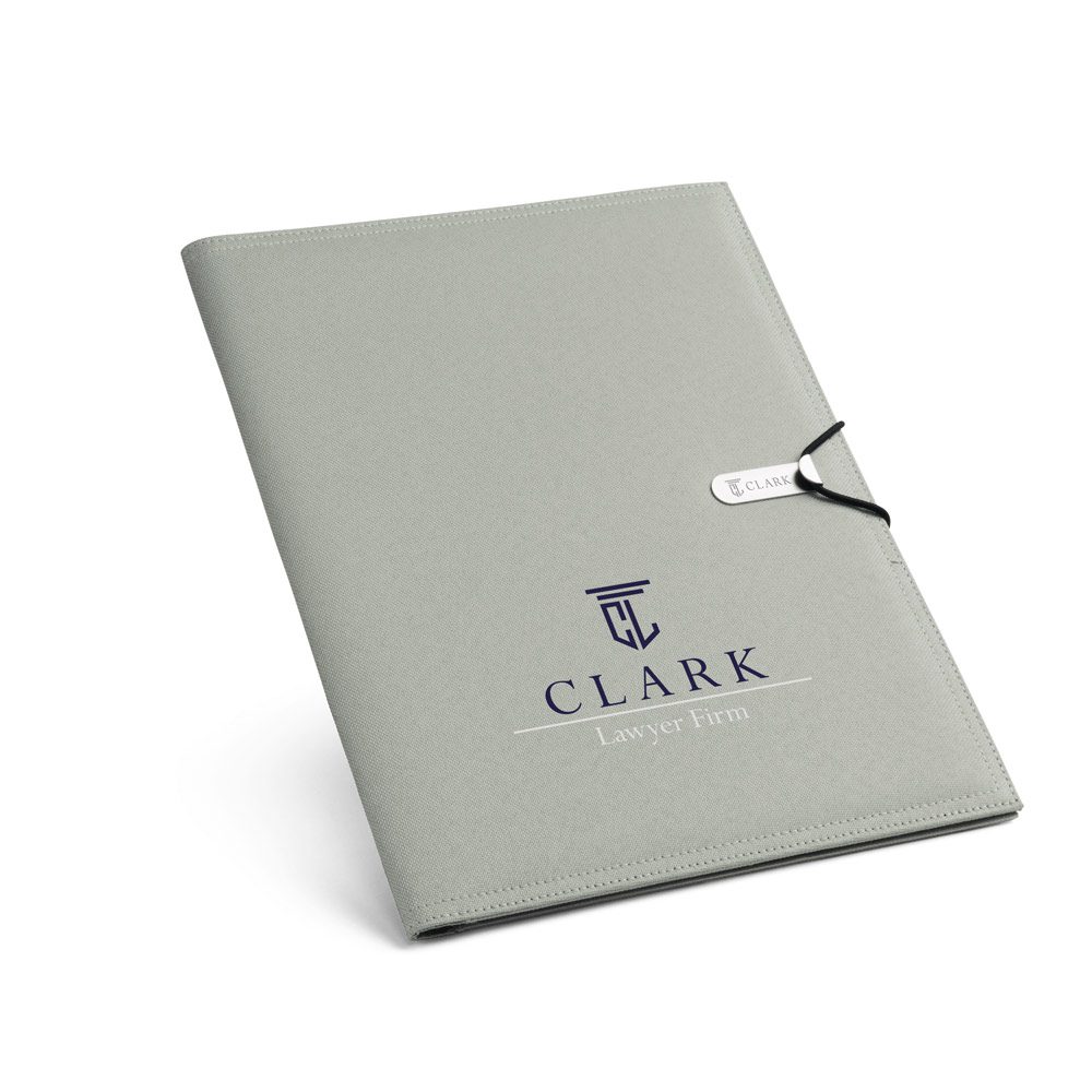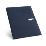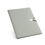 Pasta A4 em 600D com fecho elástico. A pasta contém um bloco de 20 folhas pautadas, 3 bolsos interiores e suporte para esferográfica (não inclusa). 240 x 325 x 15 mm