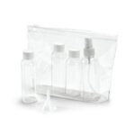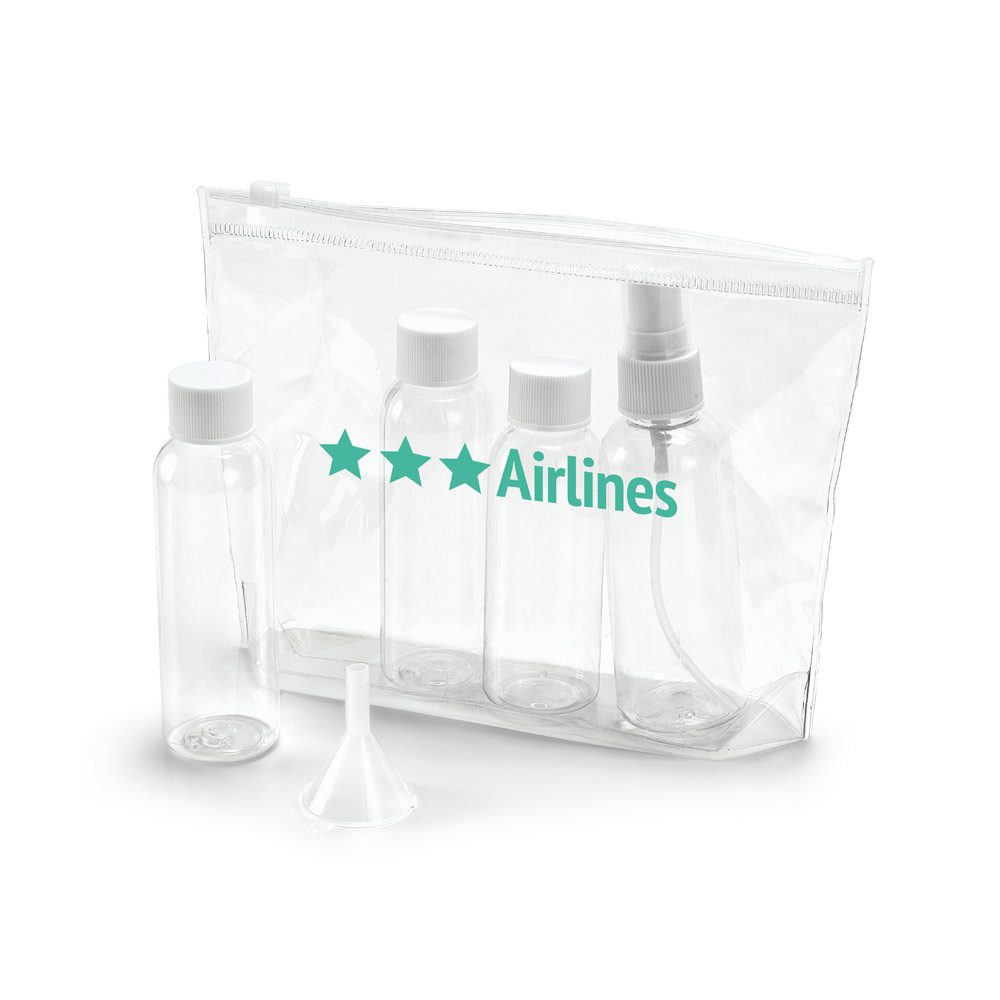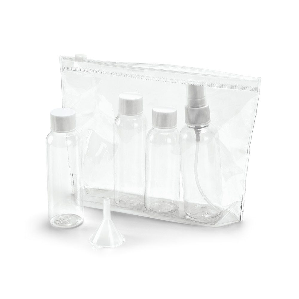 Bolsa de cosméticos hermética em PVC. Incluso 3 frascos (2 x 65 ml e 60 ml), 1 vaporizador (80 ml) e 1 funil. Apropriada para transporte em cabine de avião. 190 x 155 x 40 mm