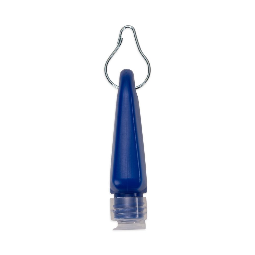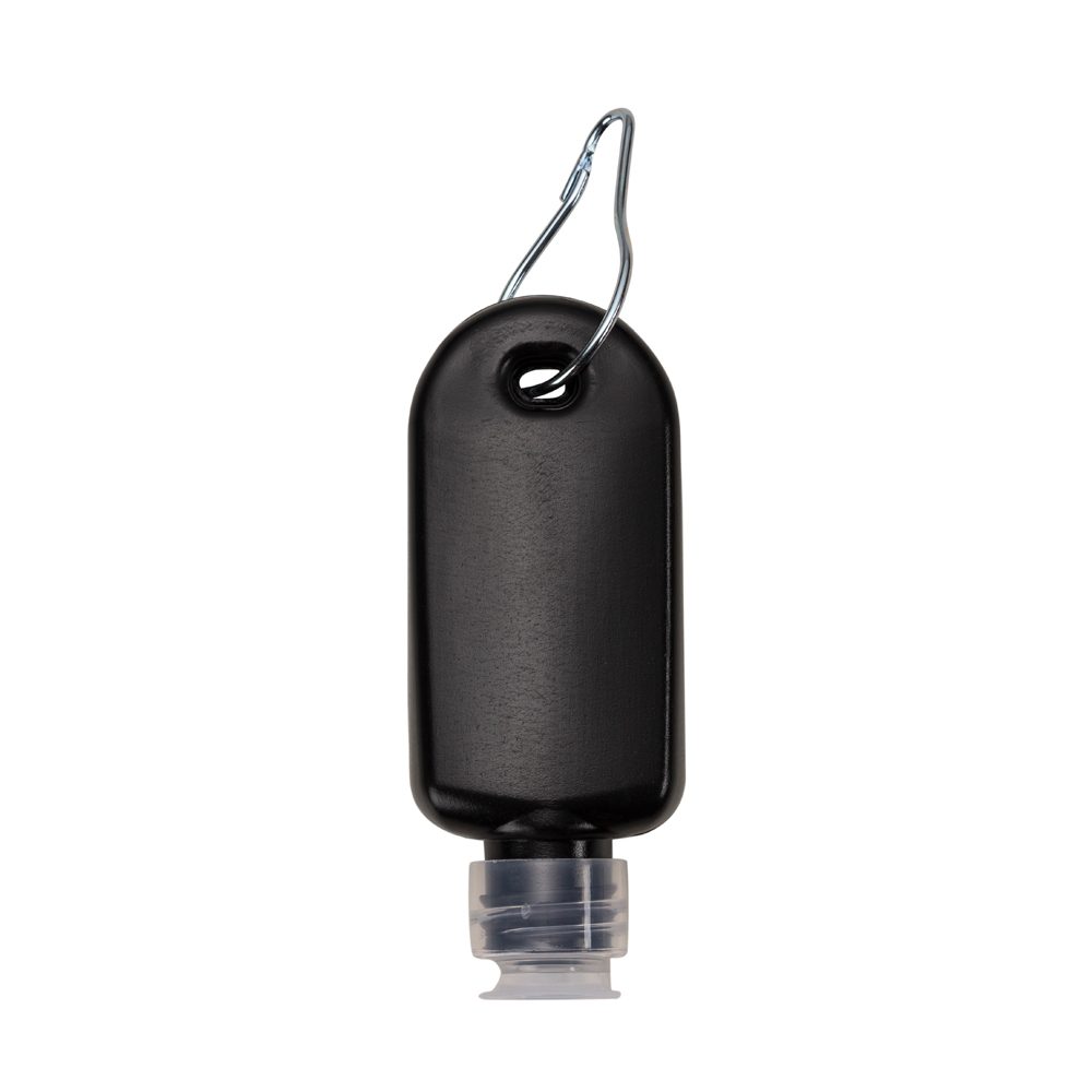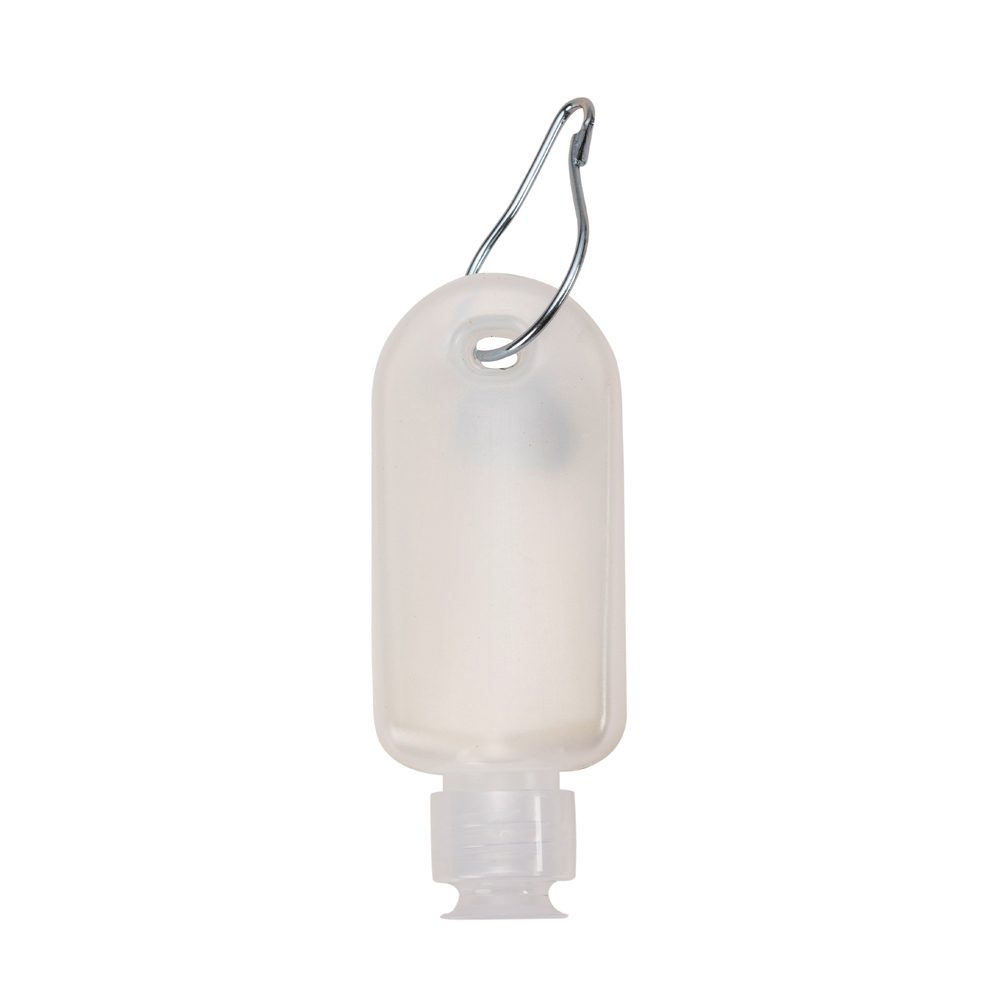 Frasco plástico para álcool gel com capacidade de 40ml, contém tampa transparente com encaixe rosqueável e acompanha chaveiro mosquetão com trava de pressão.