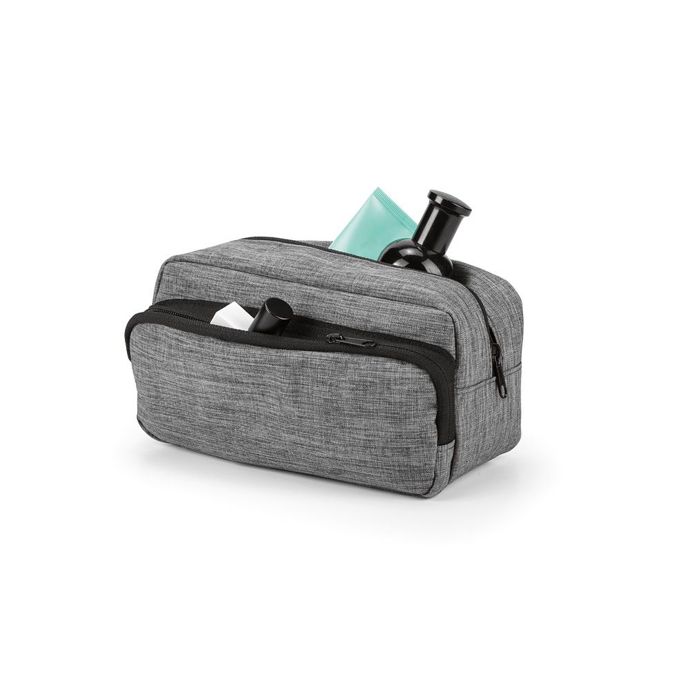 Bolsa de cosméticos em 300D de alta densidade com pega, bolso frontal, interior forrado e zíper. 220 x 115 x 115 mm