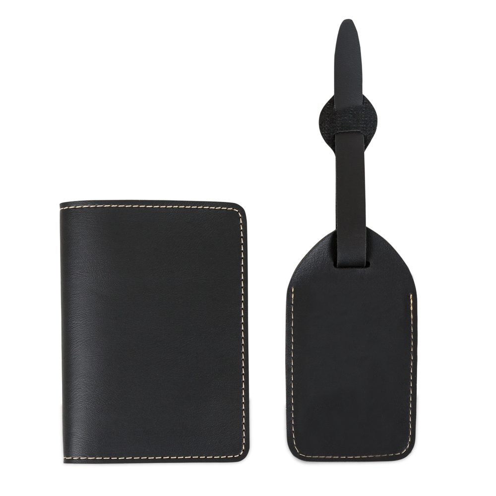 Kit viagem 2 peças Bidins em couro sintético. Possui porta passaporte com três divisórias para cartões e identificador de bagagem com fivela ajustável.