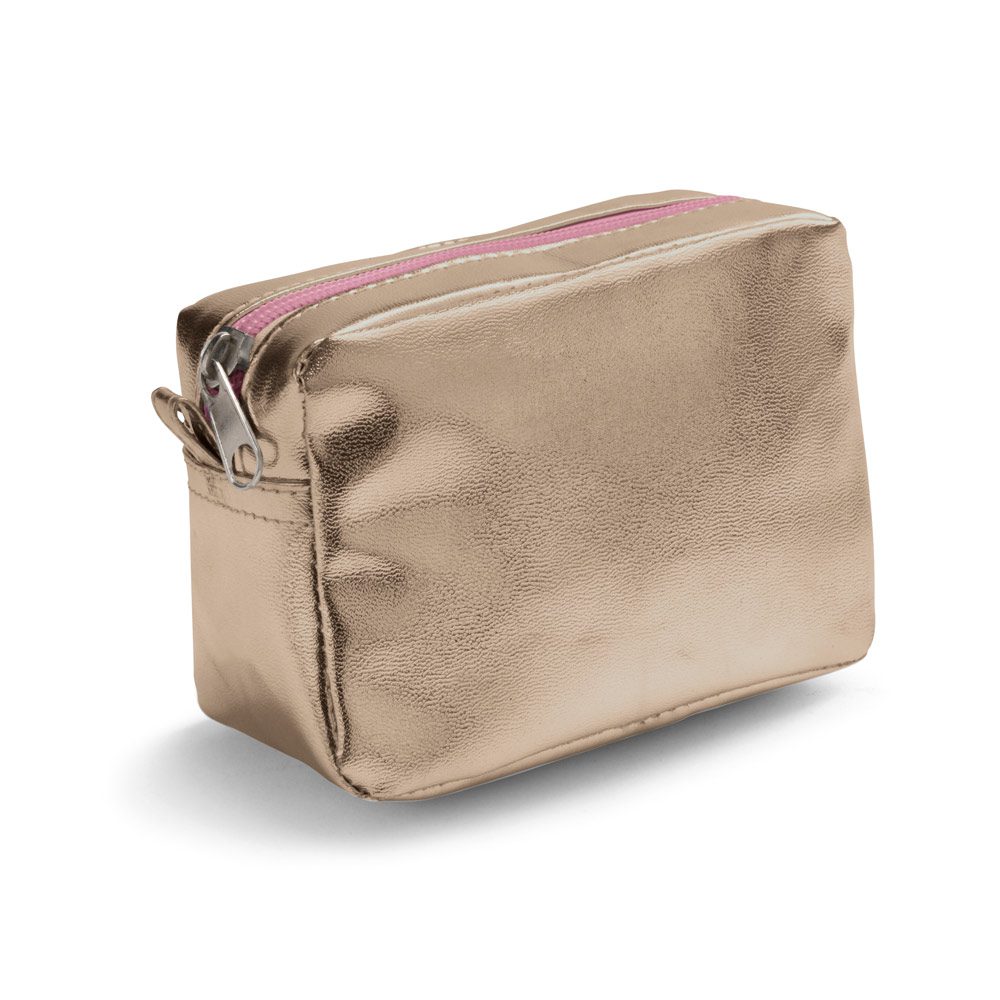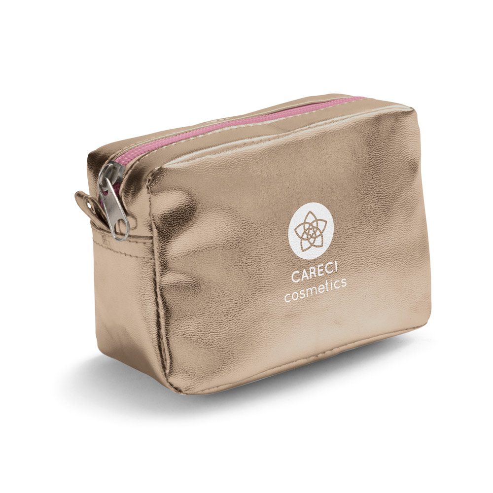 Bolsa multiusos em PVC com zíper, disponível em cores metalizadas. Prática e compacta ideal para uso diário ou em viagem. 140 x 95 x 70 mm