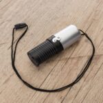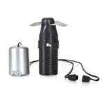 Mini ventilador plástico de mão, base preta com relevo e tampa prata(com trava) com um cordão. Para utilização necessita duas pilhas AA, compartimento inferior com seta na tampa indicado o lado que abre e sinal positivo e negativo indicado posição das pilhas, botão on/off apara ligar/desligar. Possui hélice plástica na cor cinza.