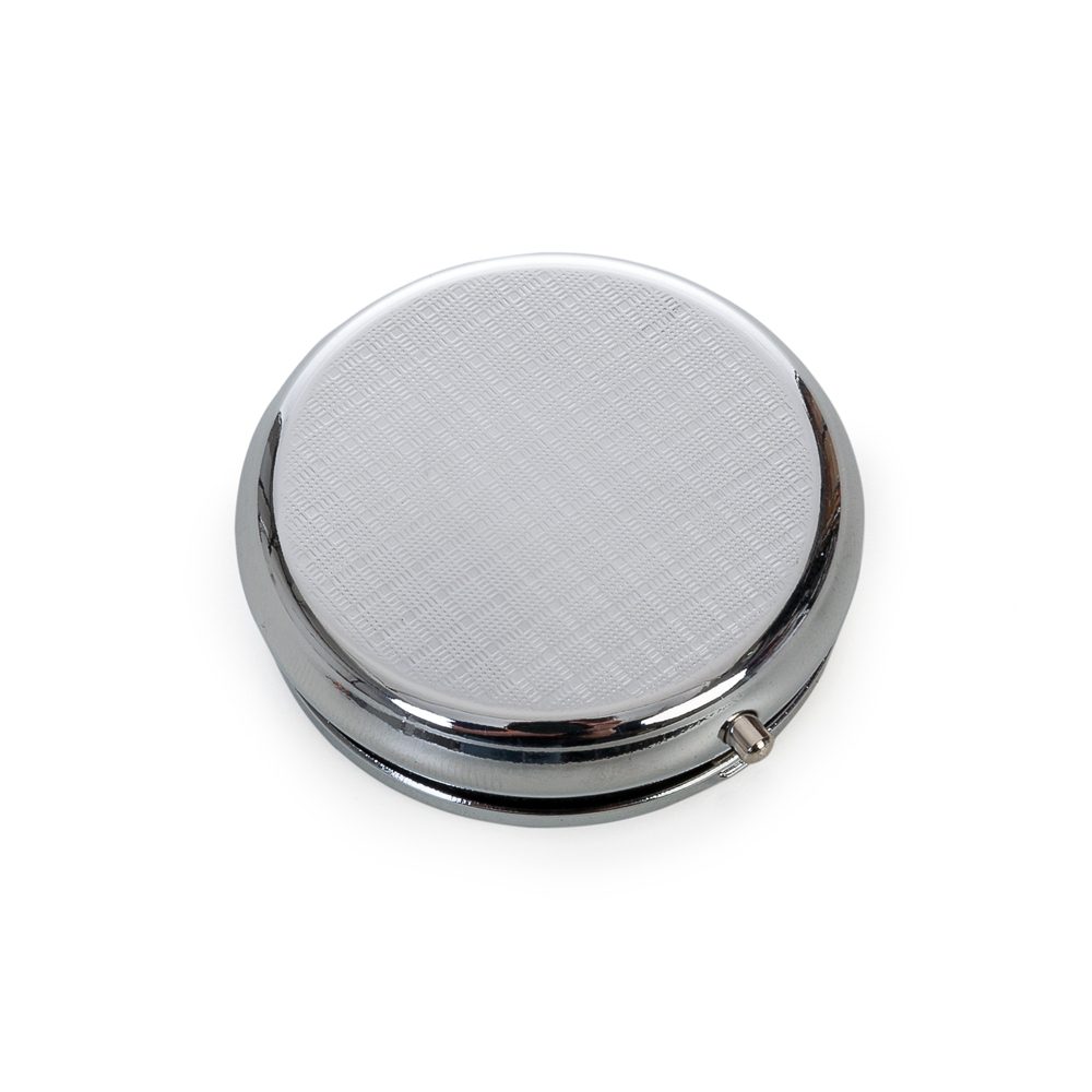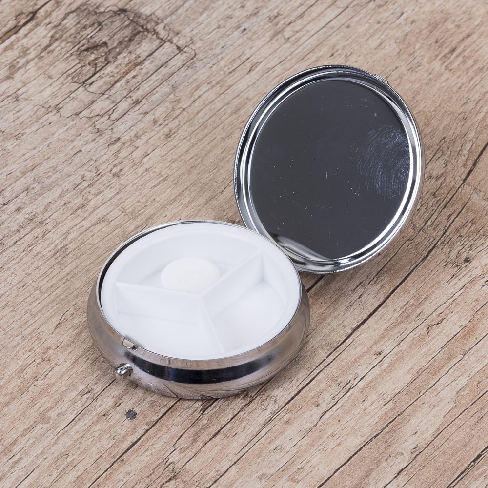 Porta comprimido redondo de metal, parte superior(tampa) brilhante externo e interno e lado inferior com detalhes estilo mosaico. Parte interna com três divisórias plásticas, possui um botão para abrir.