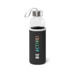 Squeeze em vidro e aço inox com alça na tampa para facilitar o transporte e capacidade até 520 ml. Fornecido com luva em soft shell. Food grade. Caixa branca 94651 vendida opcionalmente. ø65 x 225 mm