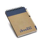 Caderno de bolso espiral com 60 folhas não pautadas de papel reciclado e capa dura em cartão. Incluso esferográfica. 105 x 145 mm
