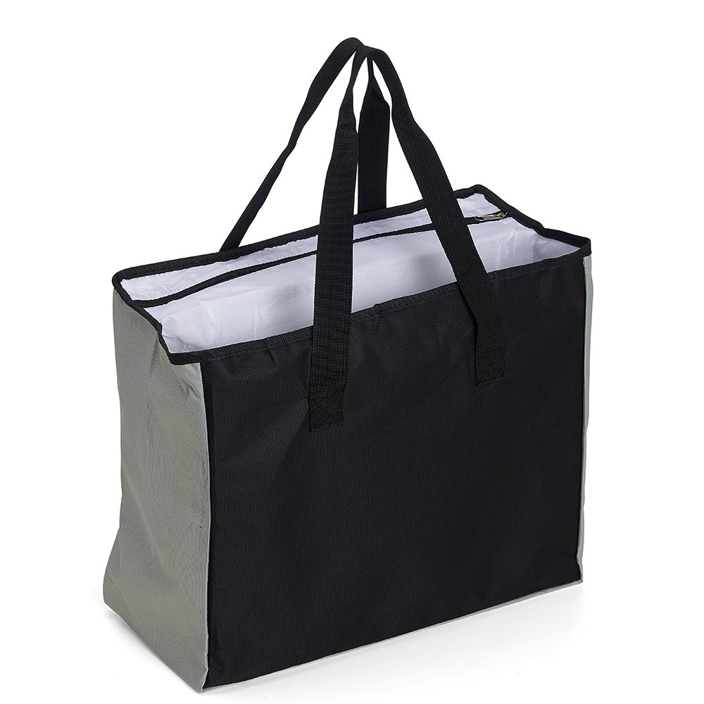 Sacola de poliéster com capacidade para 25 litros com bolso térmico. Contém um pequeno bolso interno de zíper e dois compartimentos principais, sendo um deles térmico e com fechamento de zíper.